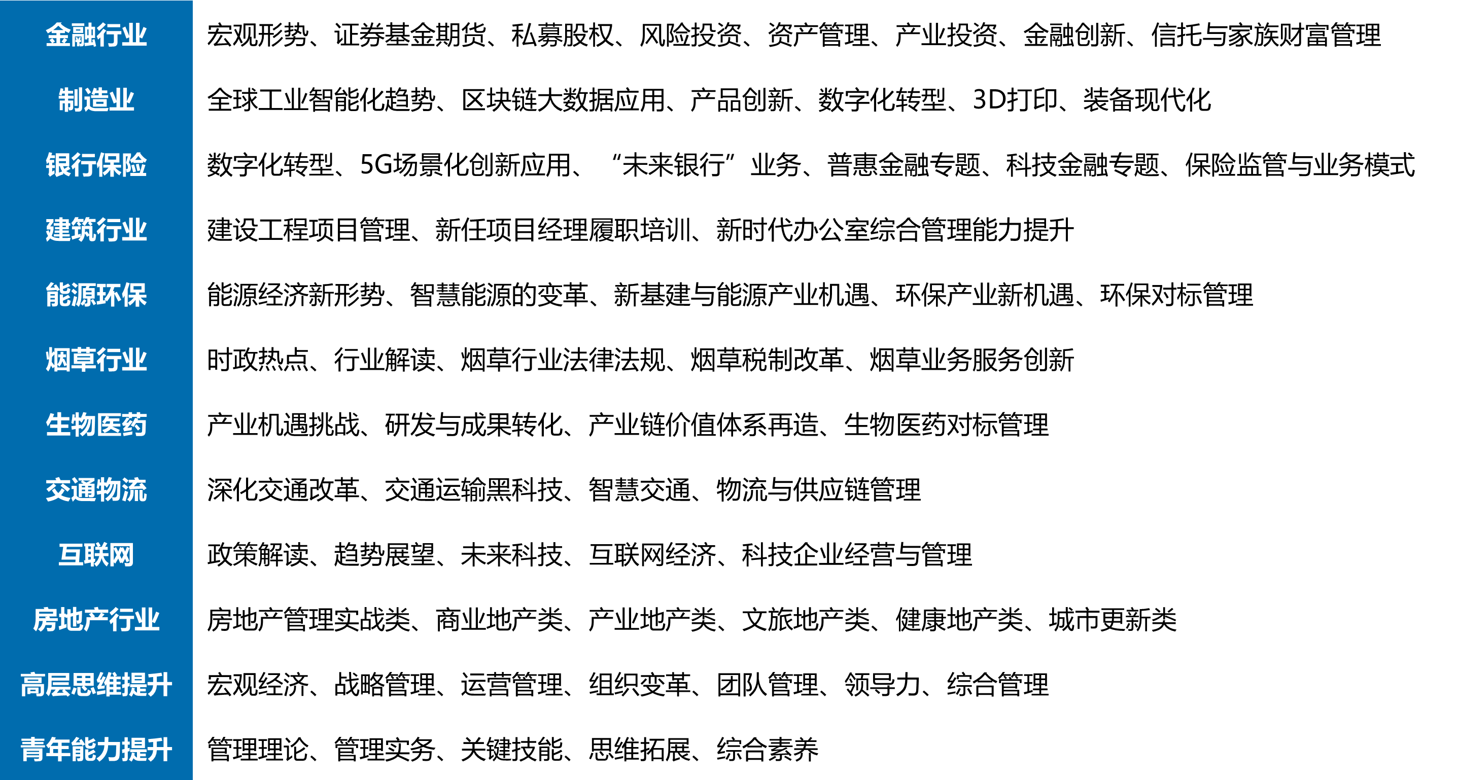 三十余年的积淀,已形成了完善的课程定制体系。根据企业所处的行业和经营业务有针对性进行课程设计、安排相关的师资,为企业的壮大发展建立了强大的知识保障。