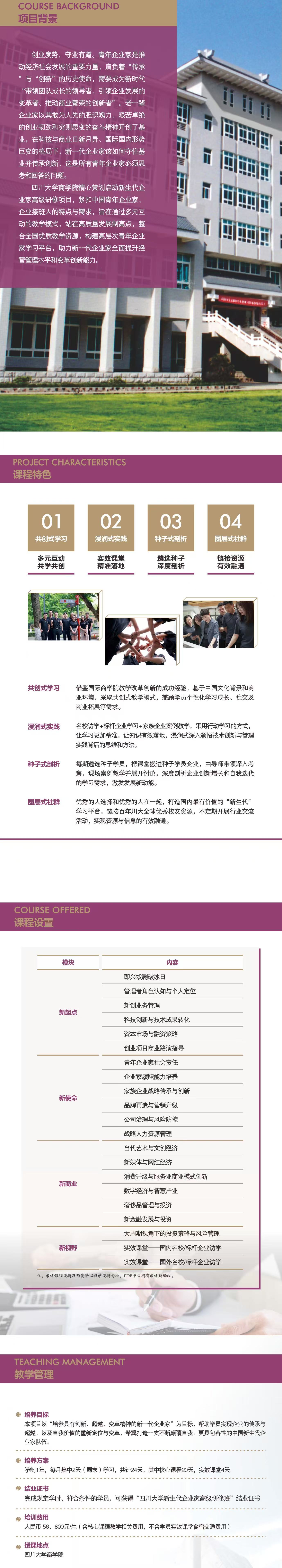 四川大学商学院精心策划启动新生代企业家高级研修项目,紧扣中国青年企业家、企业接班人的特点与需求,旨在通过多元互动的教学模式,站在高质量发展制高点,整合全国优质教学资源,构建高层次青年企业家学习平台,助力新一代企业家全面提升经营管理水平和变革创新能力。