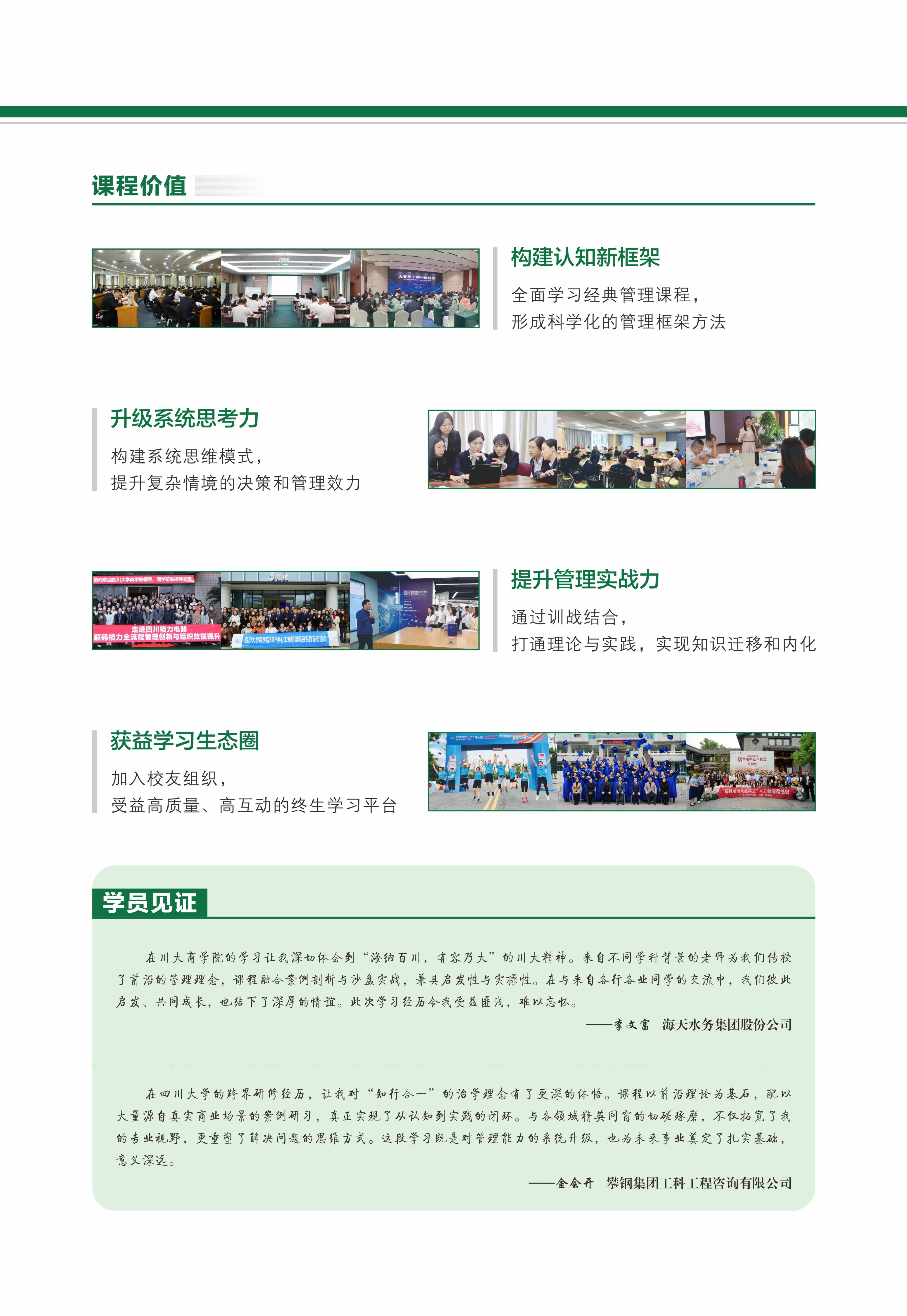 四川大学商学院“工商管理课程研修班”项目,从现实的管理情境出发,直击企业管理痛点,通过课堂讲授、案例剖析、现场教学等多种培训形式,从理论、技能与经验三个维度全方位提升管理者的核心能力。项目课程共设置“团队破冰”“战略执行”“组织发展”“营销突破”“财税风控”“管理技术”六大模块和“热点解读”“移动课堂”两个专题,旨在帮助管理者重塑管理思维、掌握管理技能、提升管理绩效,并成长为具备系统思维的实践性管理人才,助力提升企业整体运营能力。