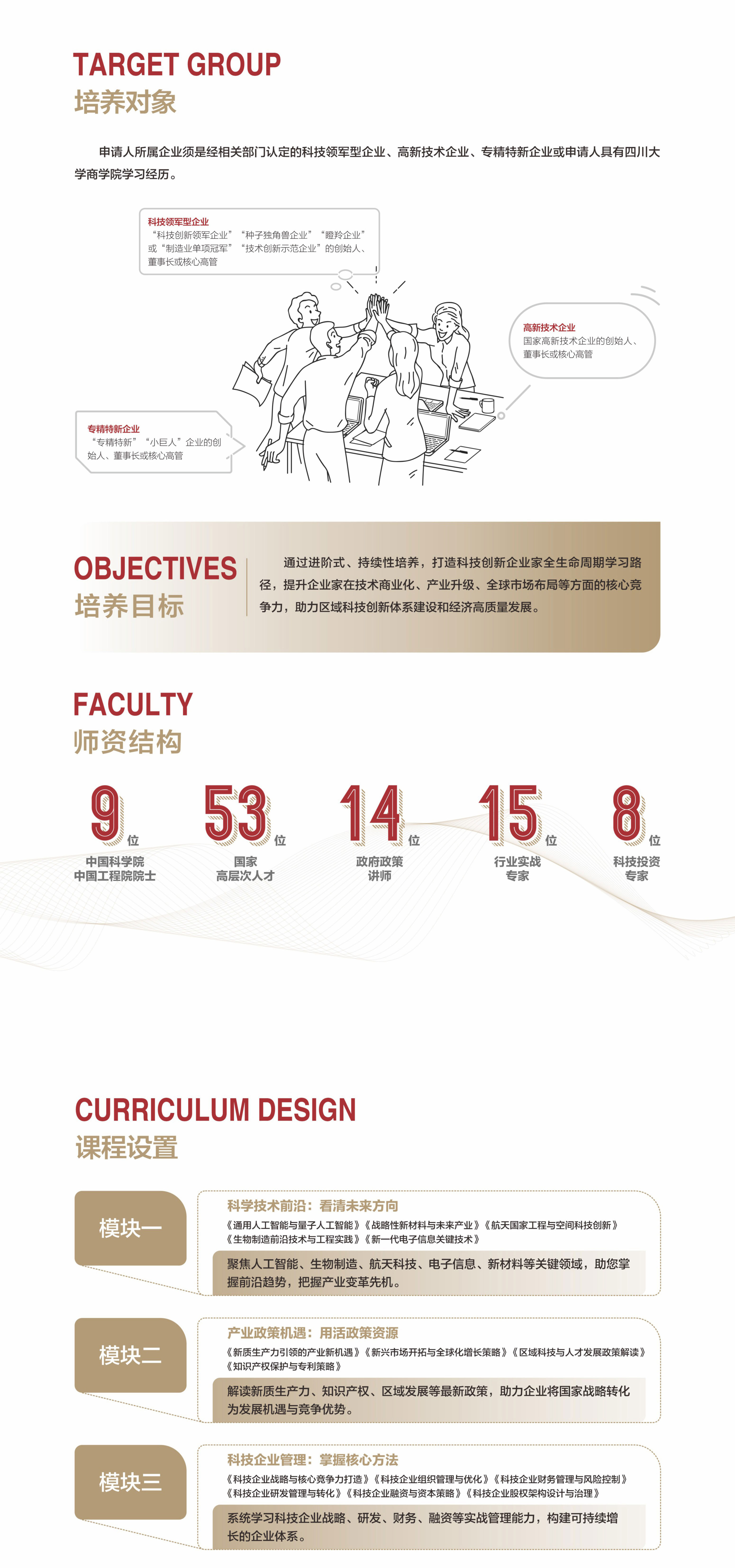 项目覆盖科创产业链基础要素知识,培养“懂技术趋势、懂产业逻辑、懂资本运作、懂市场导向、懂管理协同”的科创人才,成长为引领未来产业科技进步与区域经济跃升的复合型企业家。