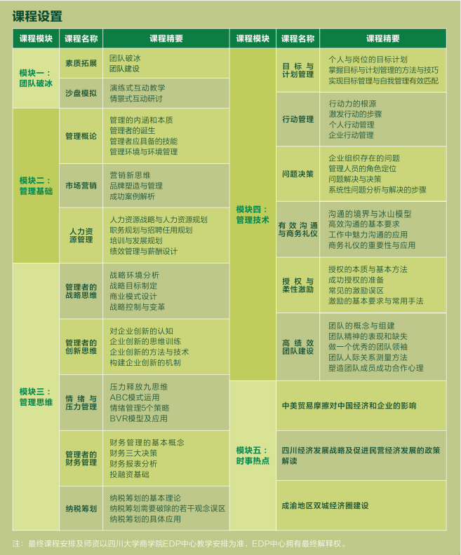 四川大学商学院依靠其深厚的学术底蕴和丰富的师资力量,结合数十年中层管理培训经验,充分整合各方优势资源,将原“工商管理课程研修班”课程升级。通过理论、实践、案例等多种培训形式,从理论、技能与经验三个维度全方位提升管理者的核心竞争力。帮助管理者在最短的时间迅速理解掌握实用的管理技能、转变管理思维、达到管理目标、提升管理绩效,从而达成提升公司核心竞争能力和整体运营能力的目的。也帮助管理者找到自身职业定位,针对性地提高自身管理技能和职业素养,成长为能够传播企业经营理念,带领下属实现企业目标的高绩效管理精英。