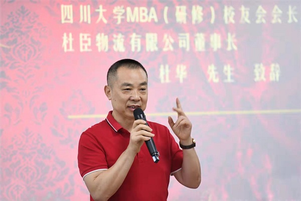 随后,四川大学MBA(研修)校友会会长、杜臣物流有限公司董事长杜华先生致辞。杜华先生向新学员们介绍了四川大学MBA(研修)校友会的基本情况,并代表校友会对第48期的新同学们致以亲切的问候。杜华先生希望新同学们积极参加校友会活动,推动校友会的发展,以商为本,以趣结缘。最后,祝愿各位新同学在四川大学学有所成。